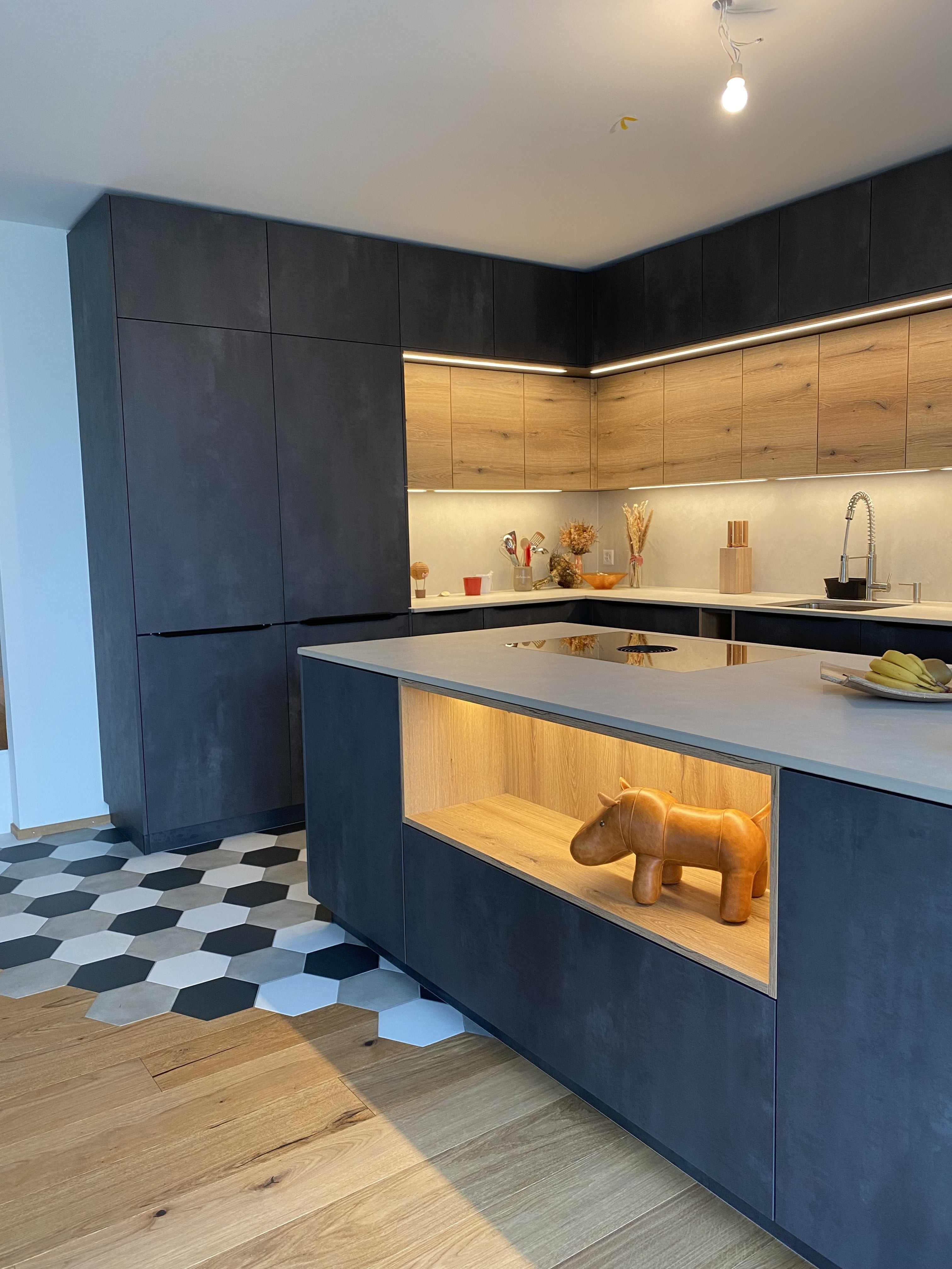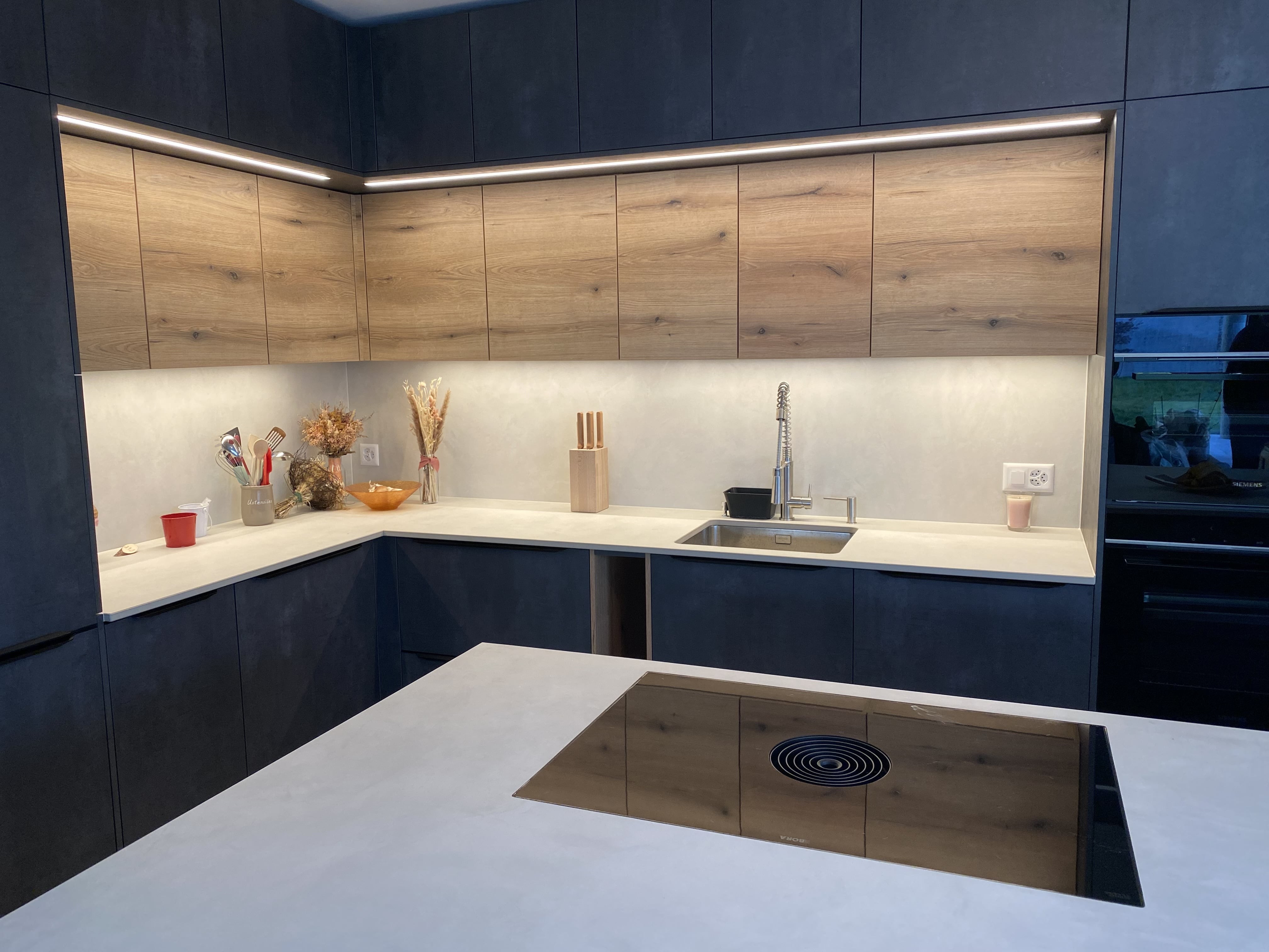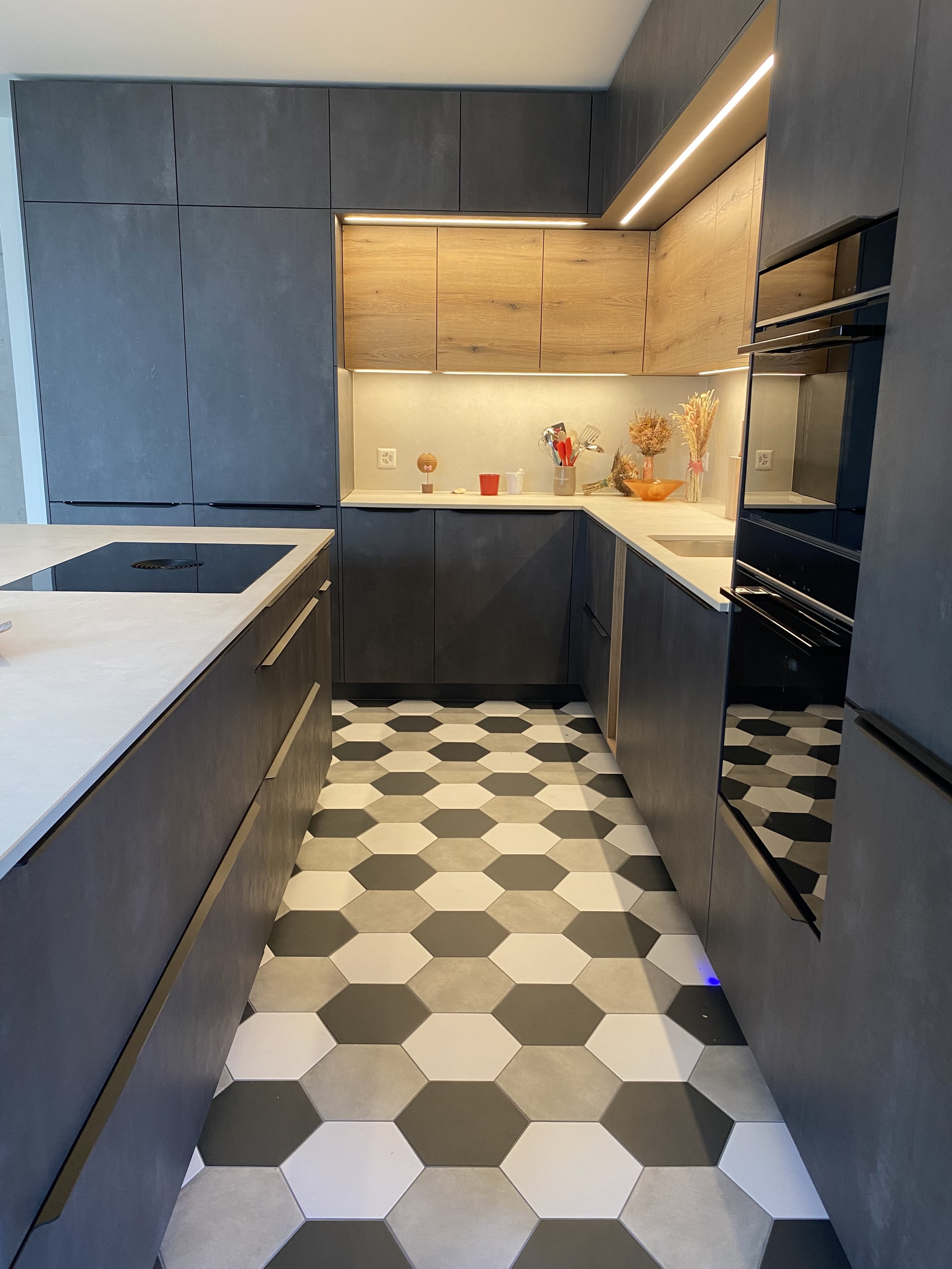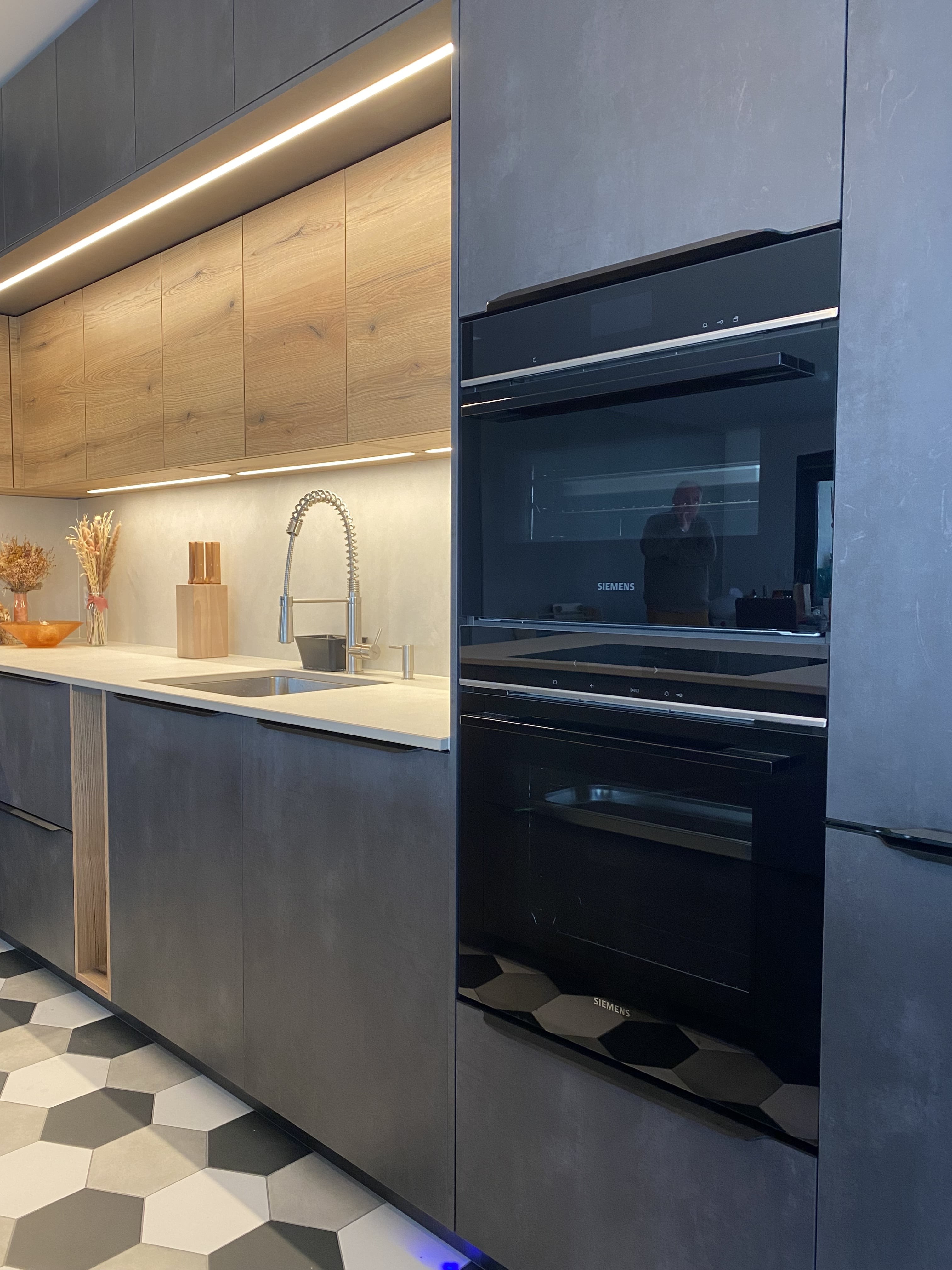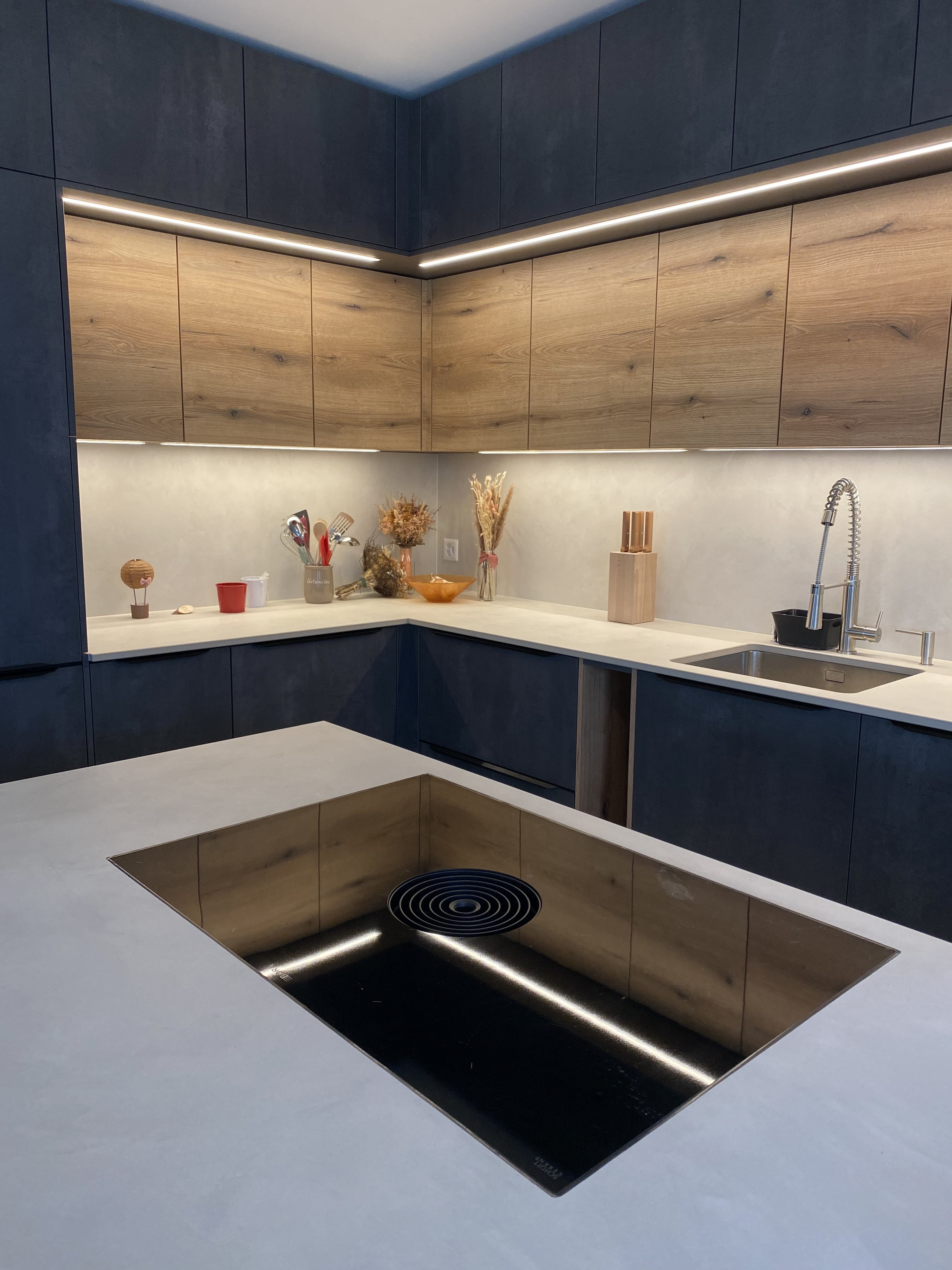 cuisine Ballerina aspect béton agencée Siemens & plan de cuisson Bora. Plan de travail & crédence en céramique 20 mm