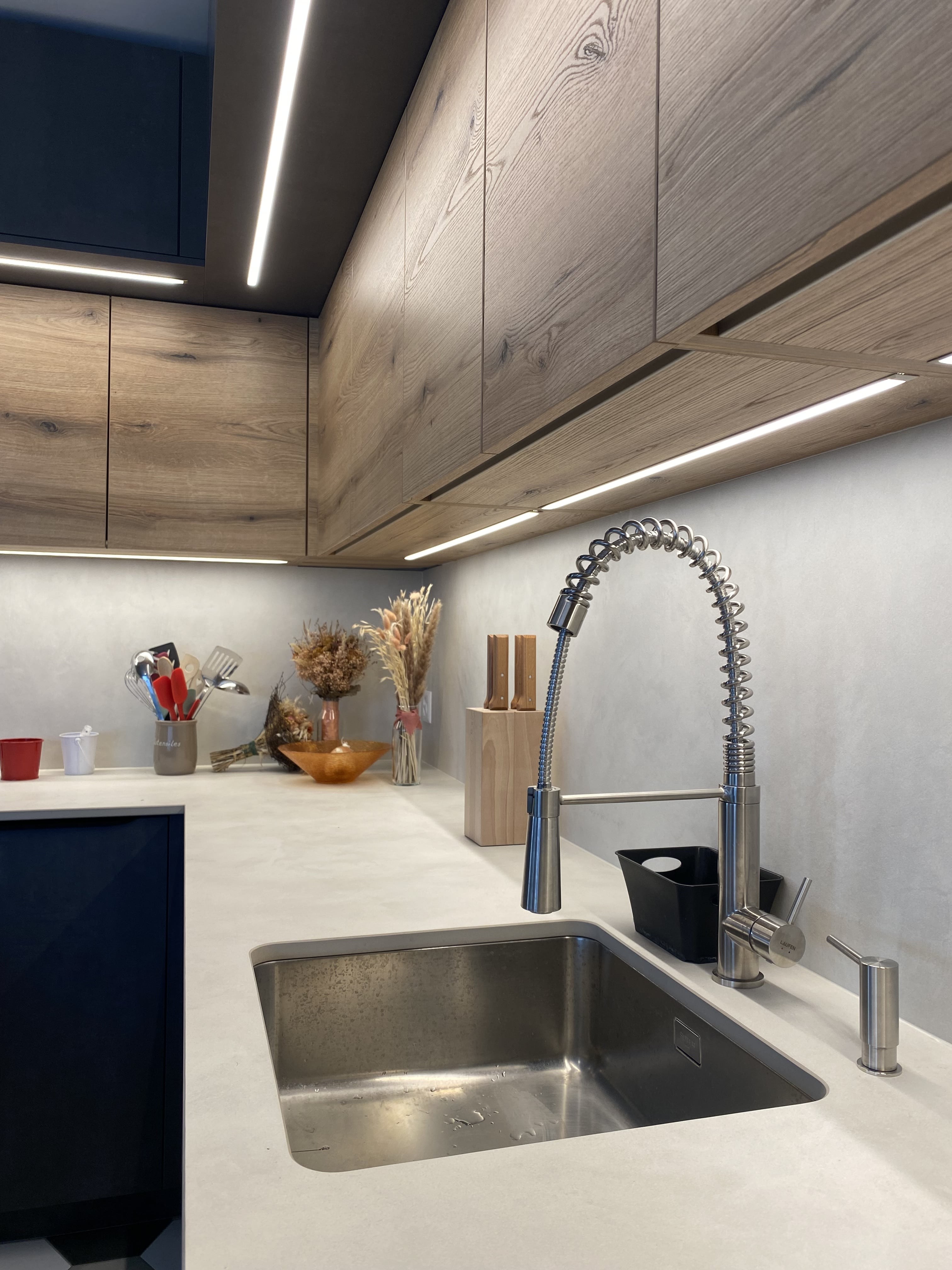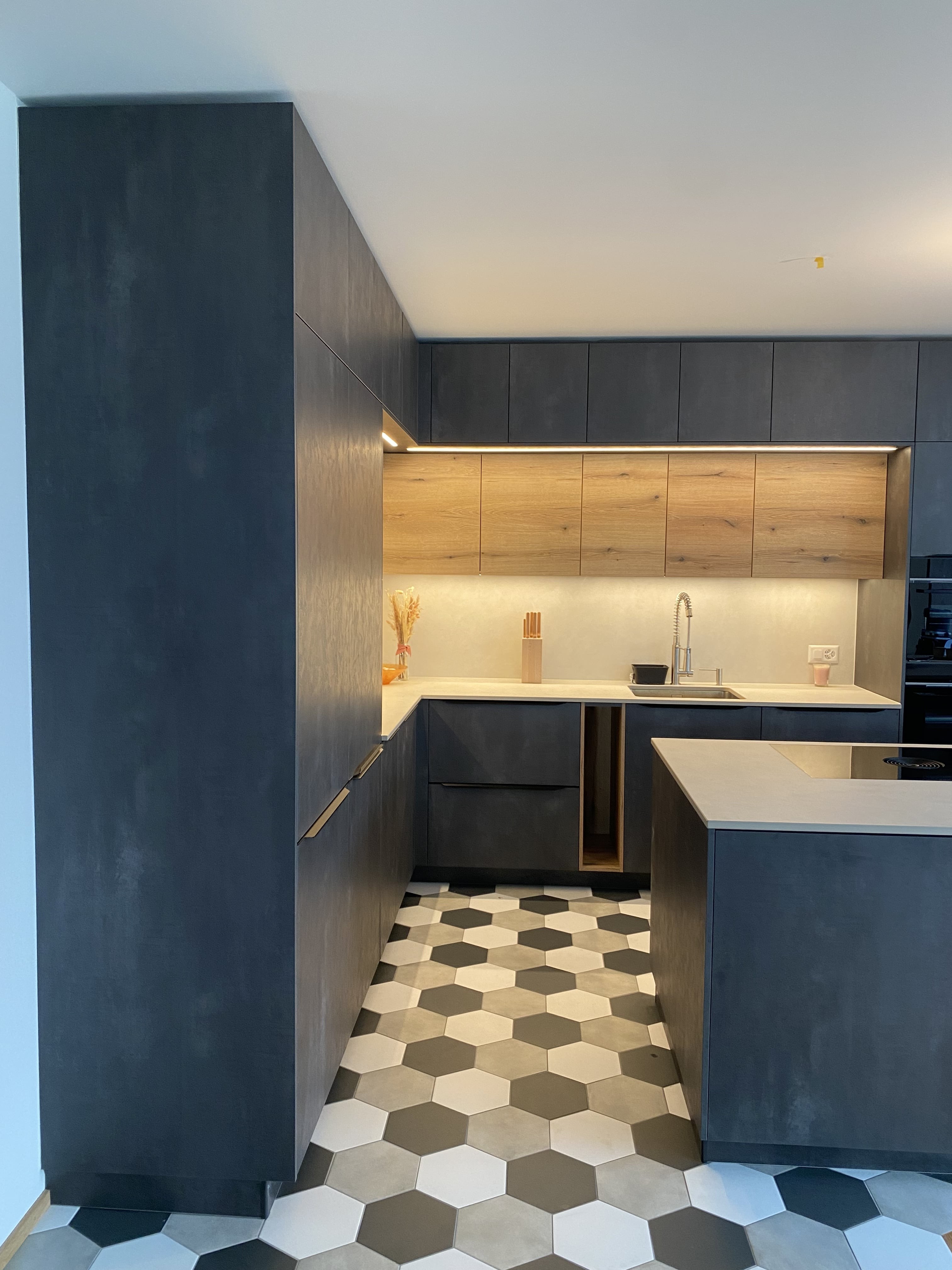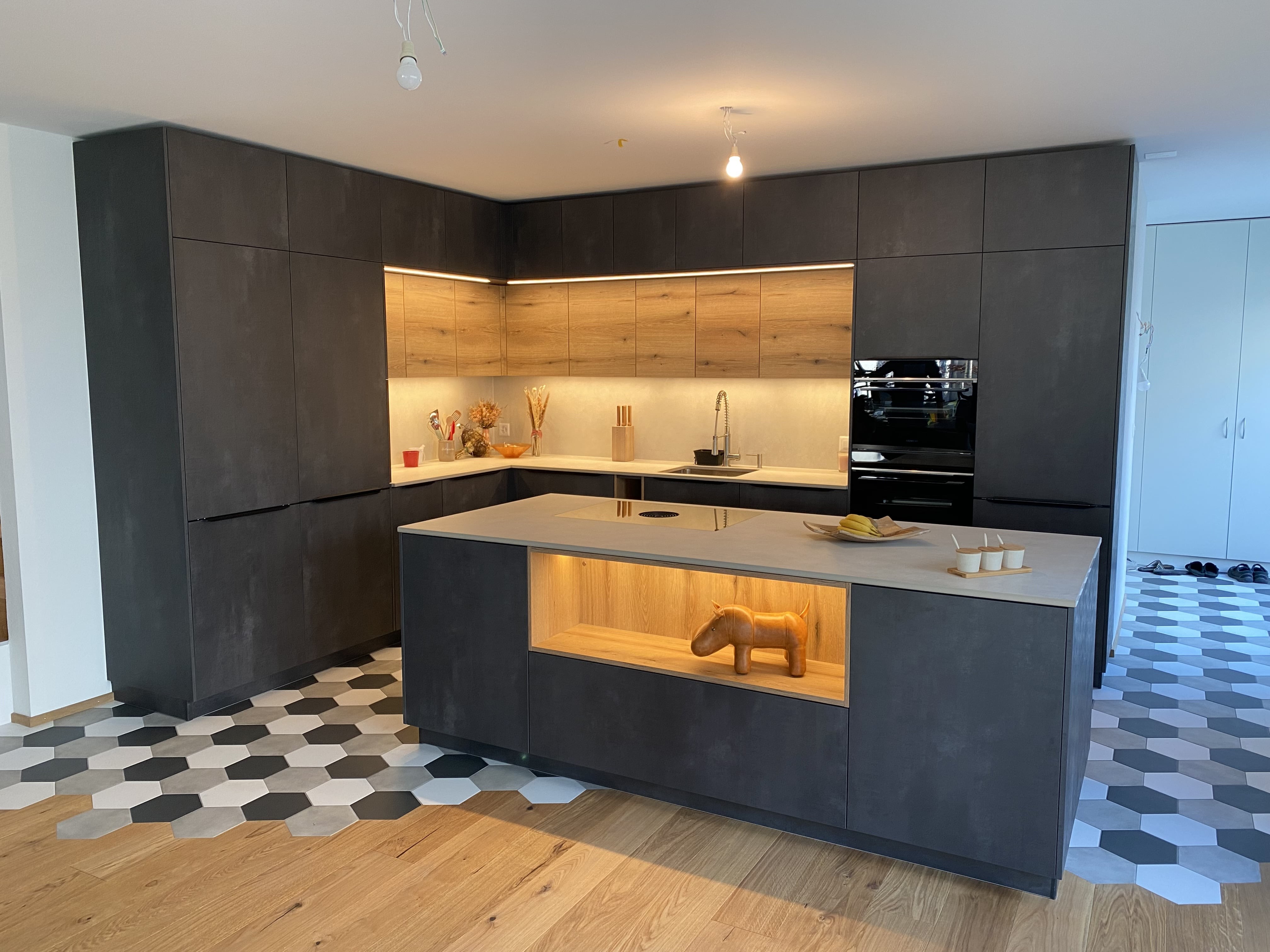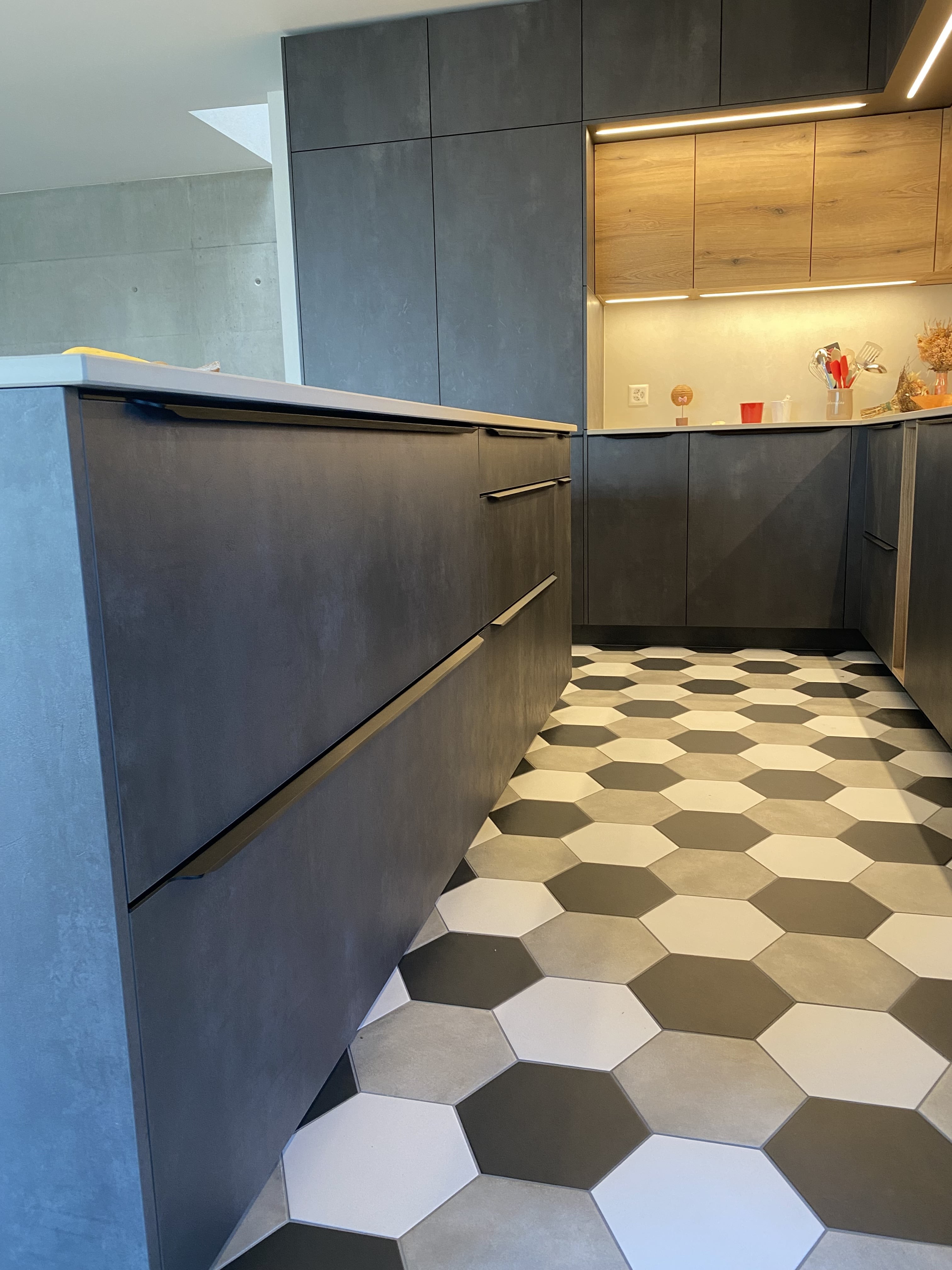 cuisine Ballerina aspect béton agencée Siemens & plan de cuisson Bora. Plan de travail & crédence en céramique 20 mm