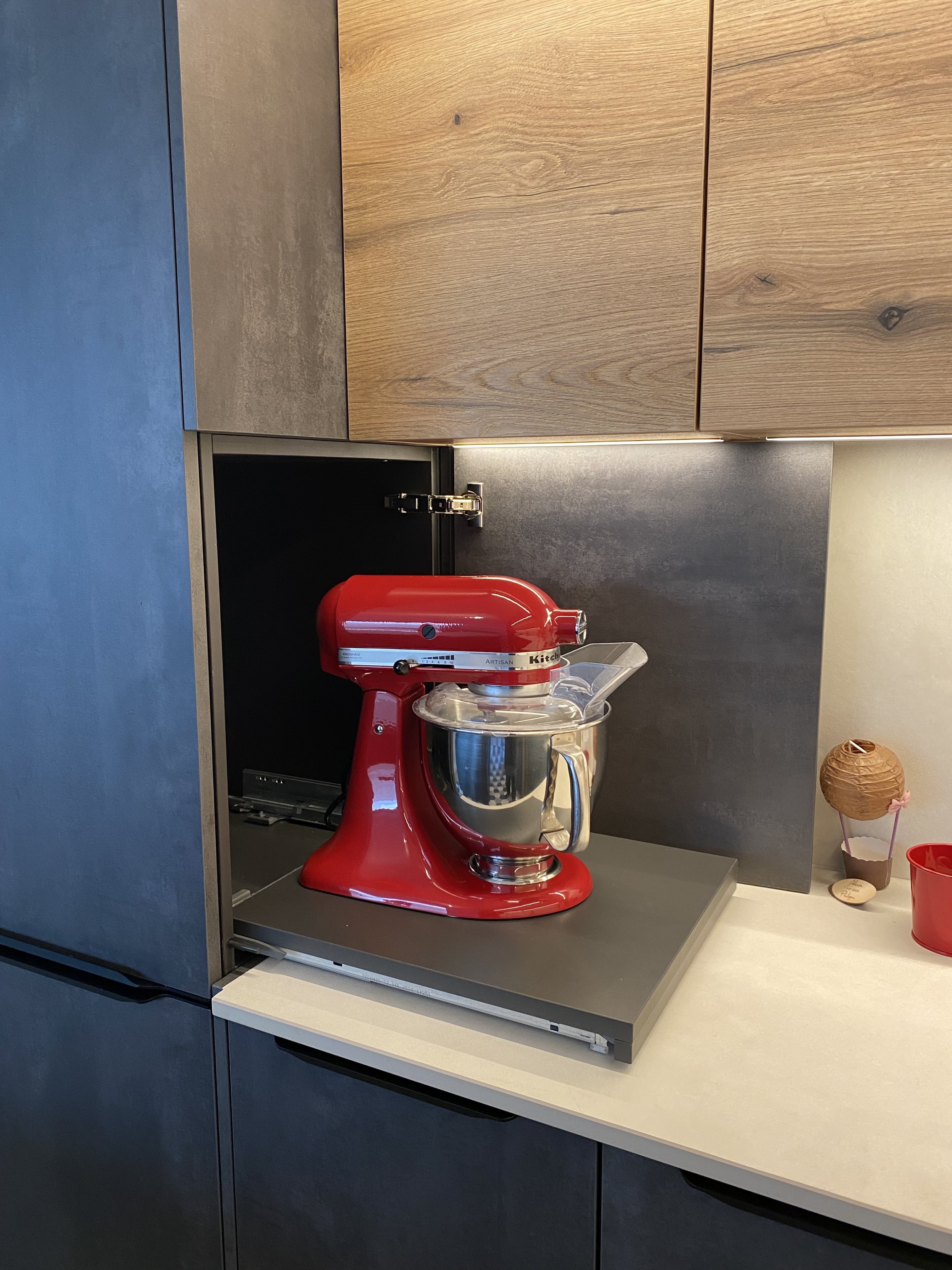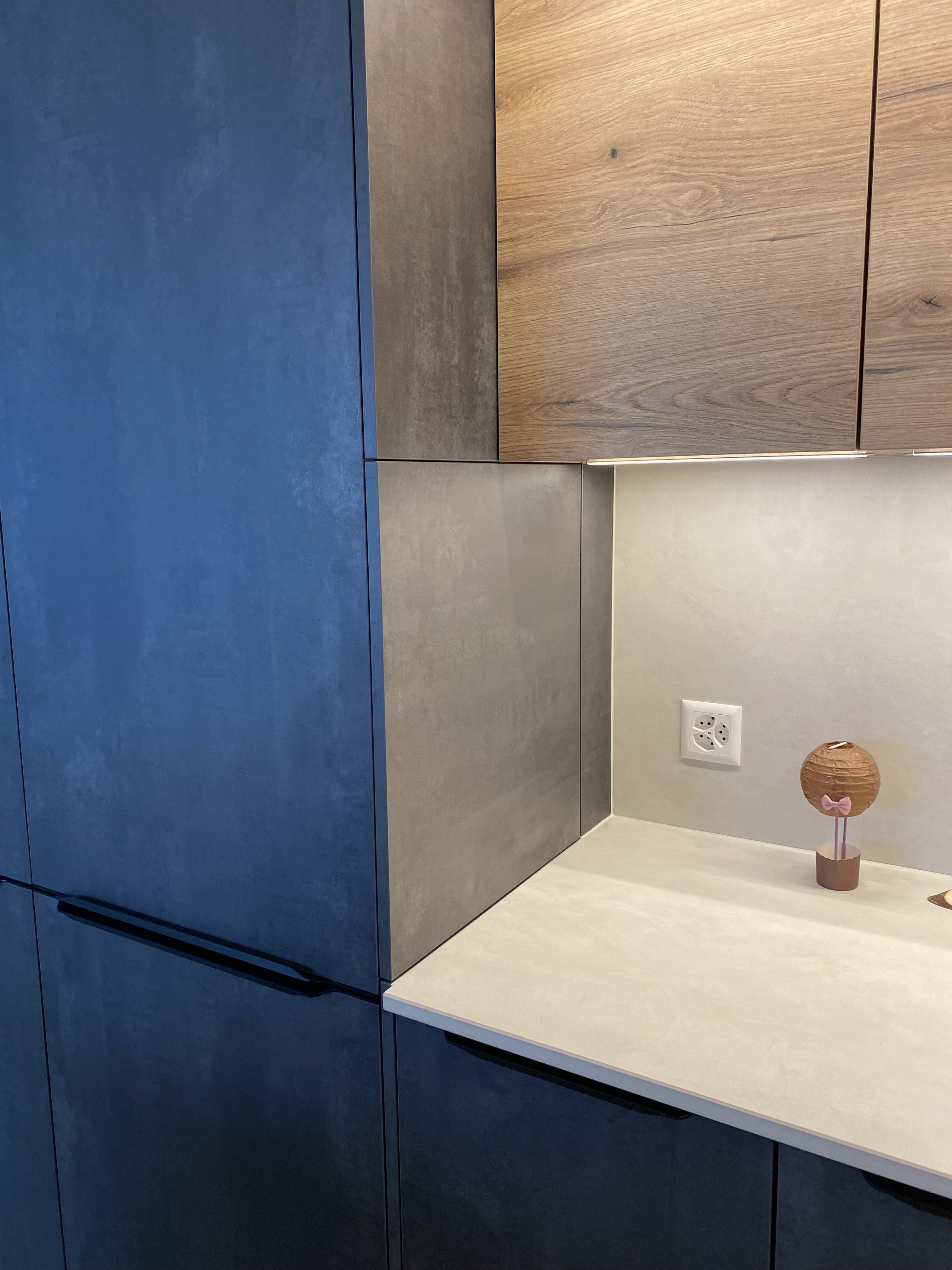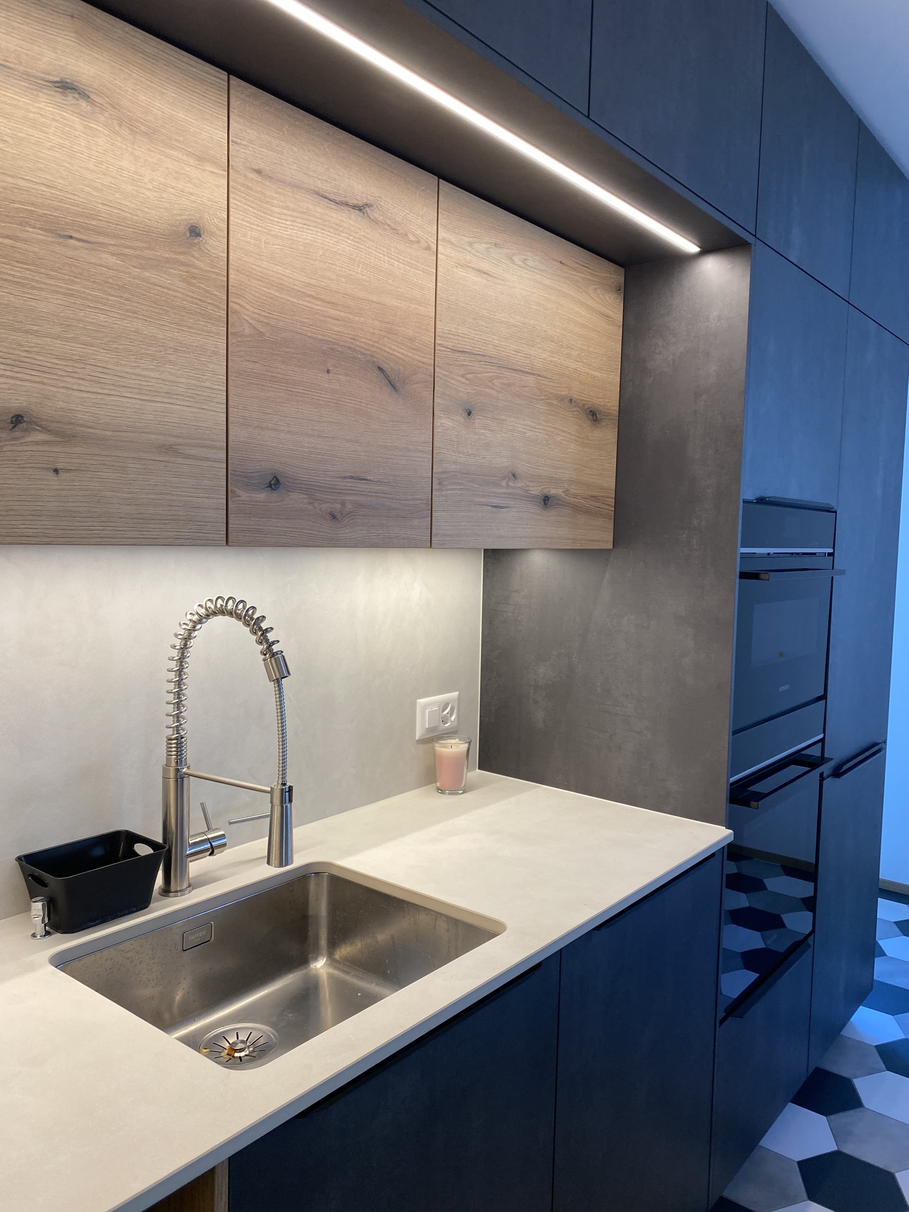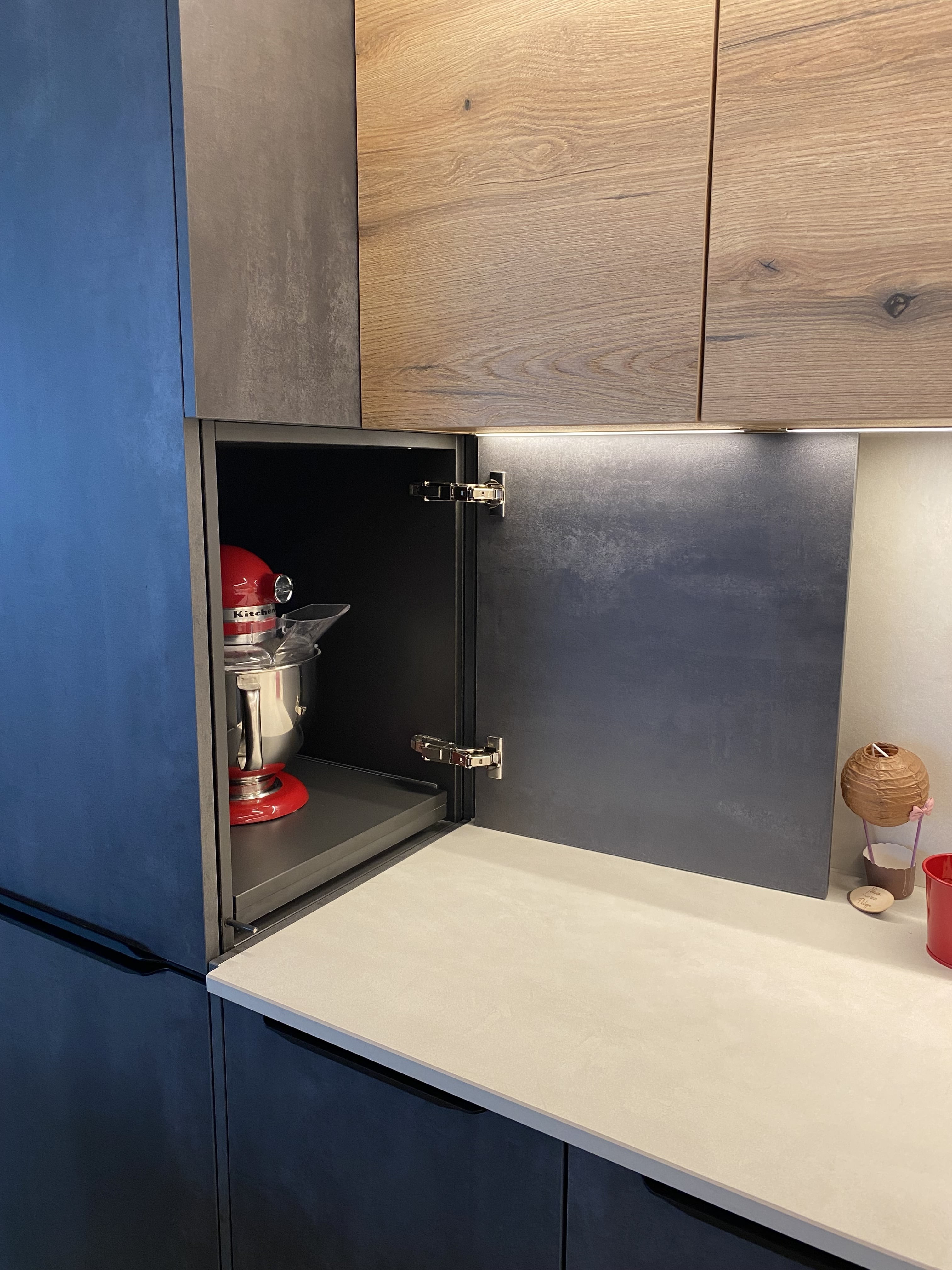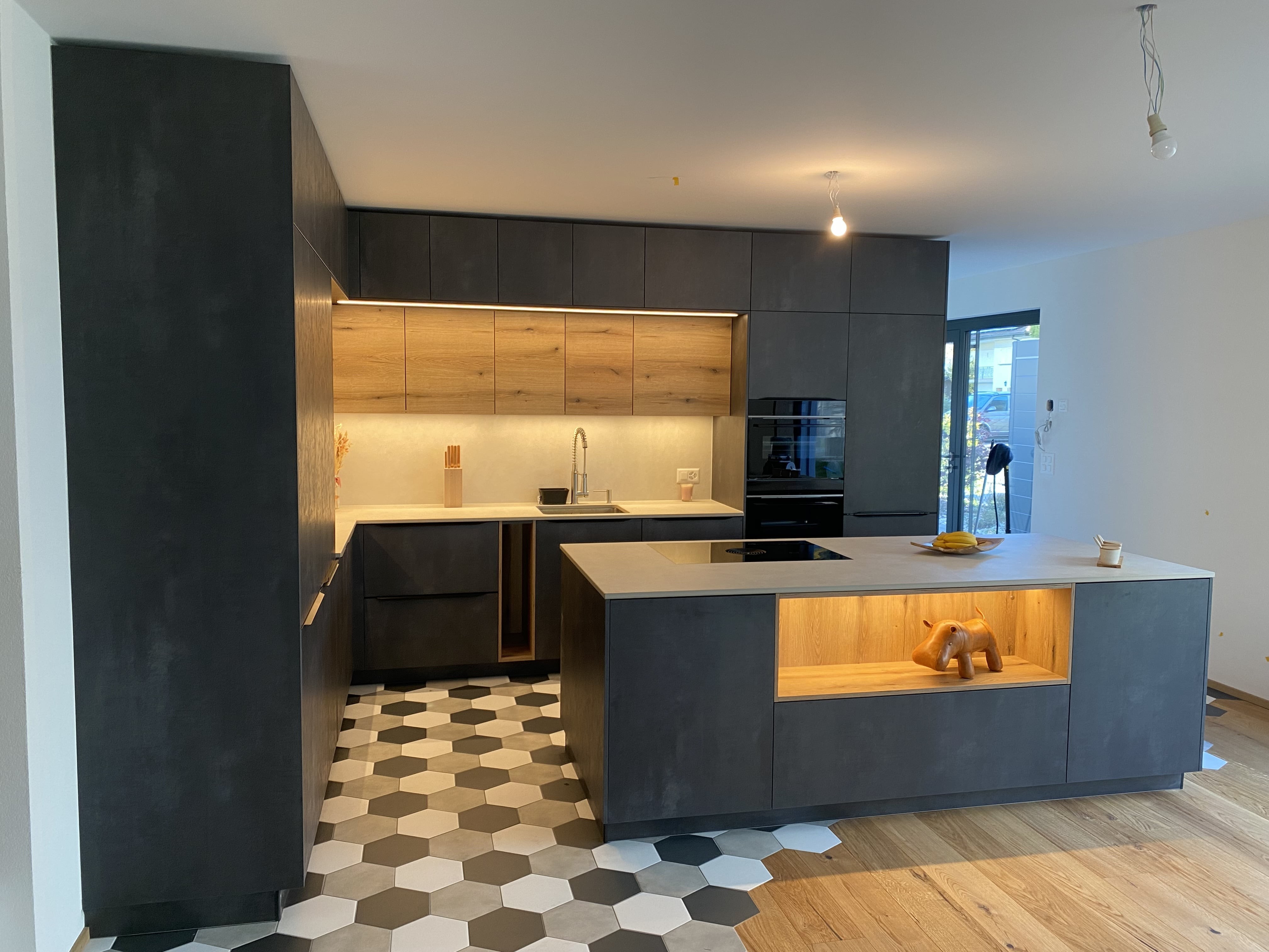 cuisine Ballerina aspect béton agencée Siemens & plan de cuisson Bora. Plan de travail & crédence en céramique 20 mm