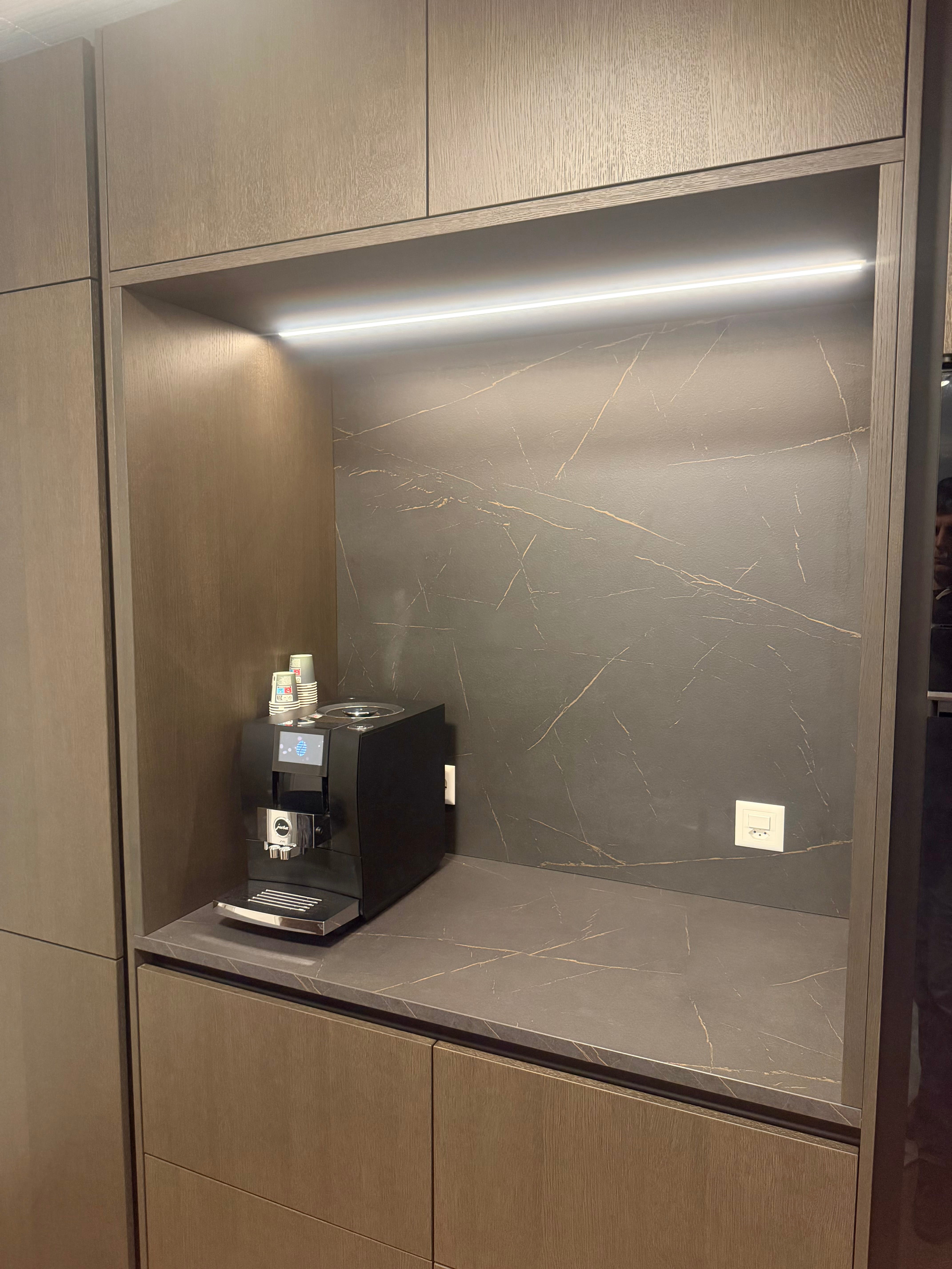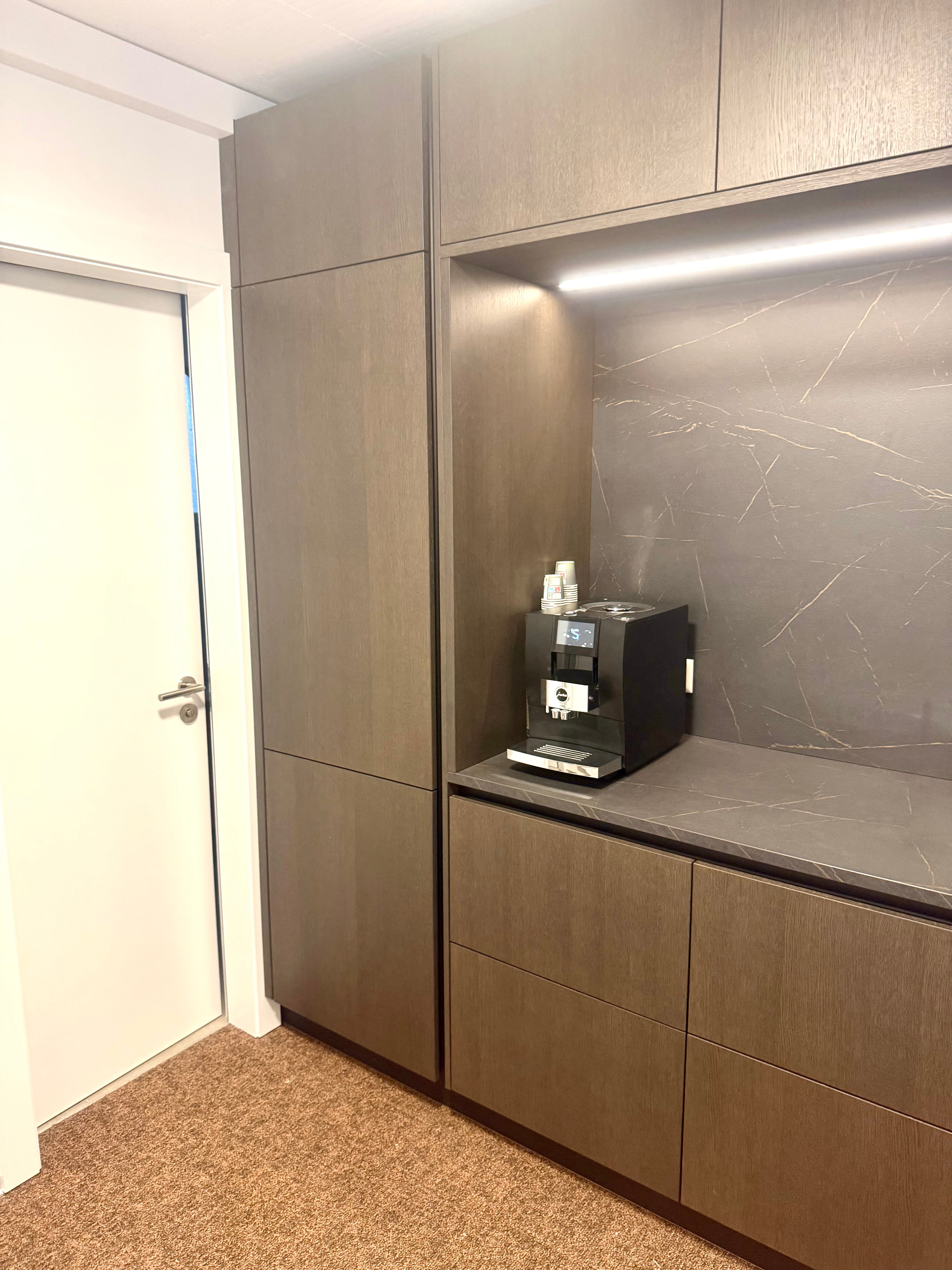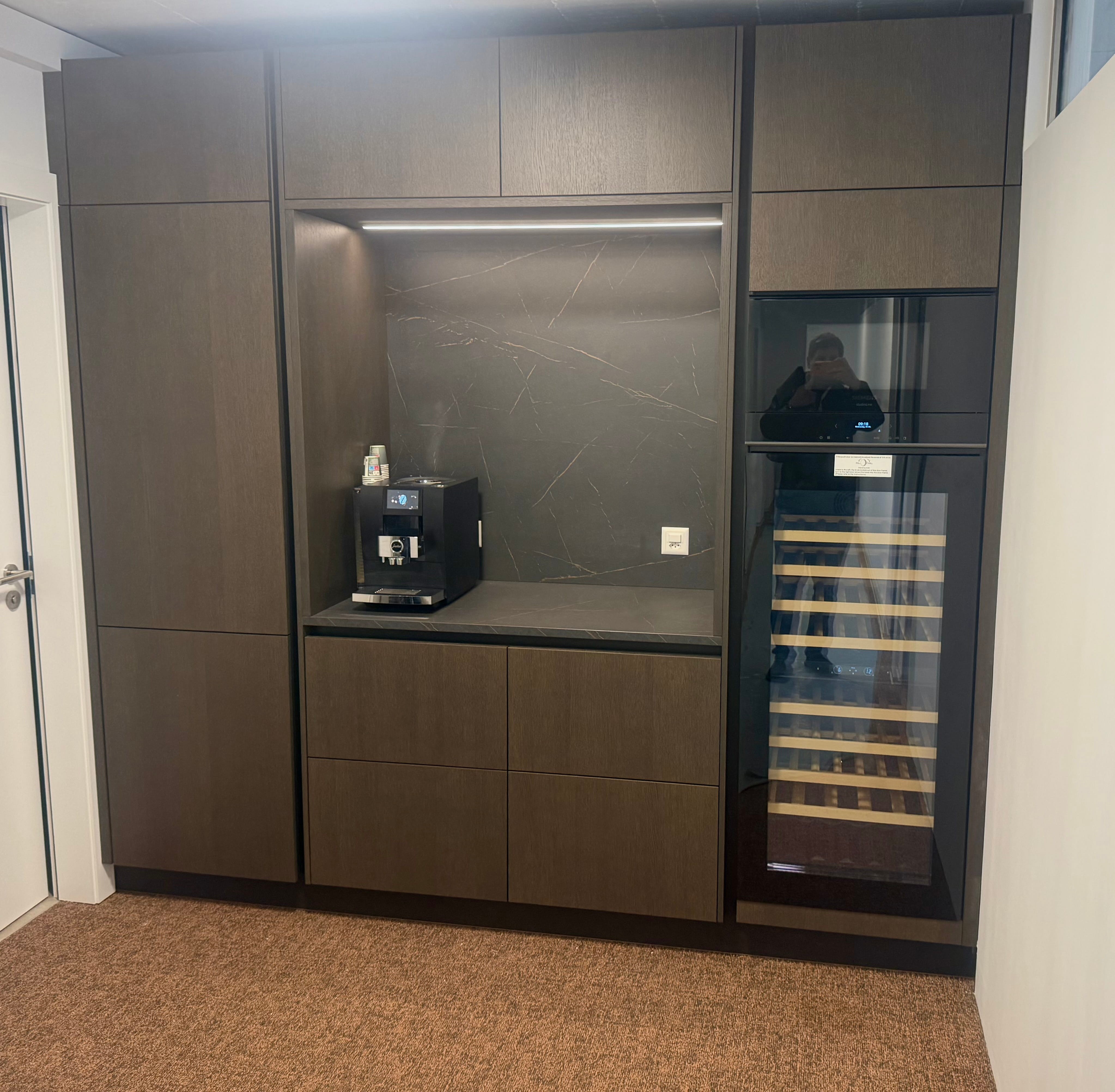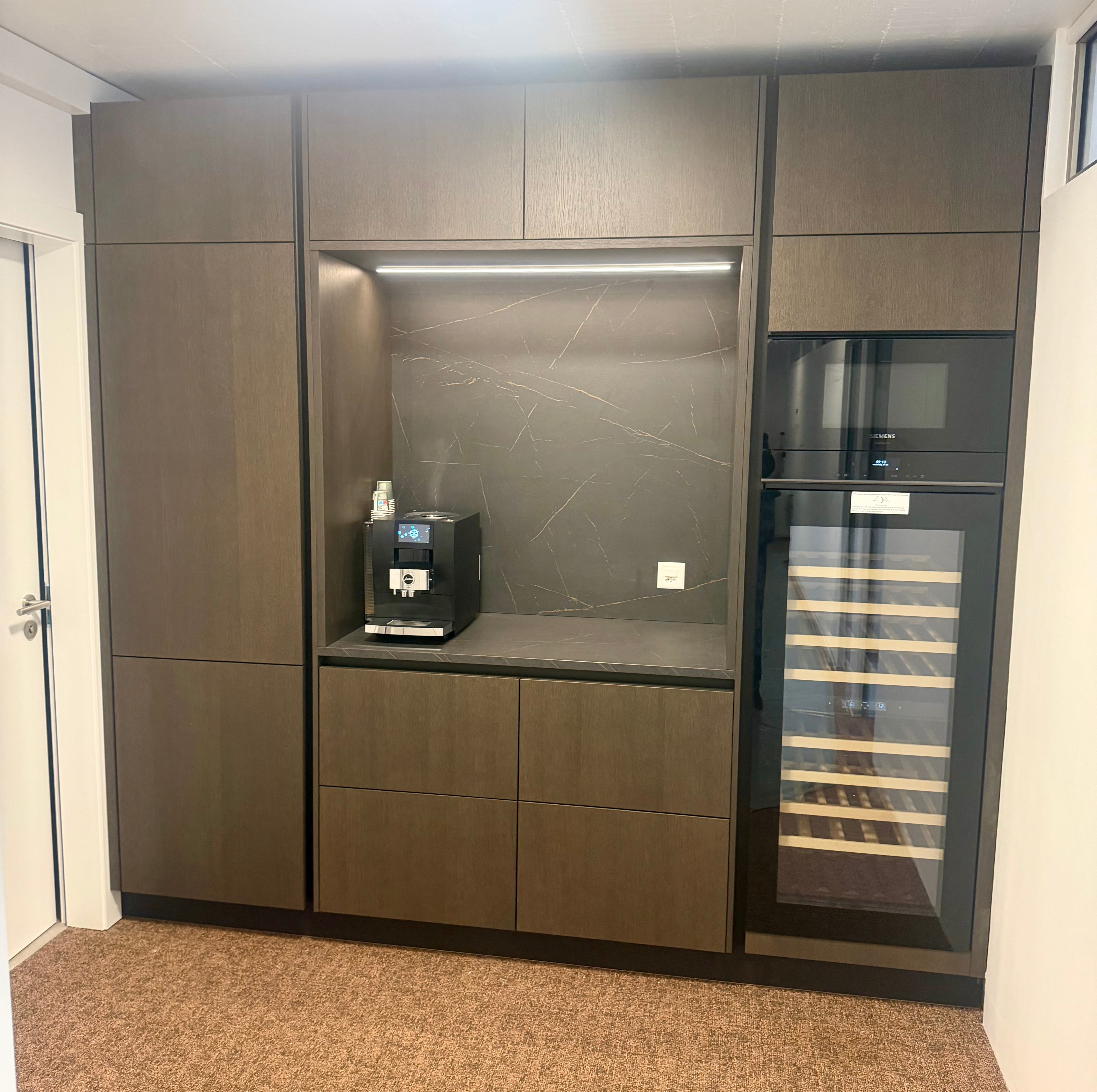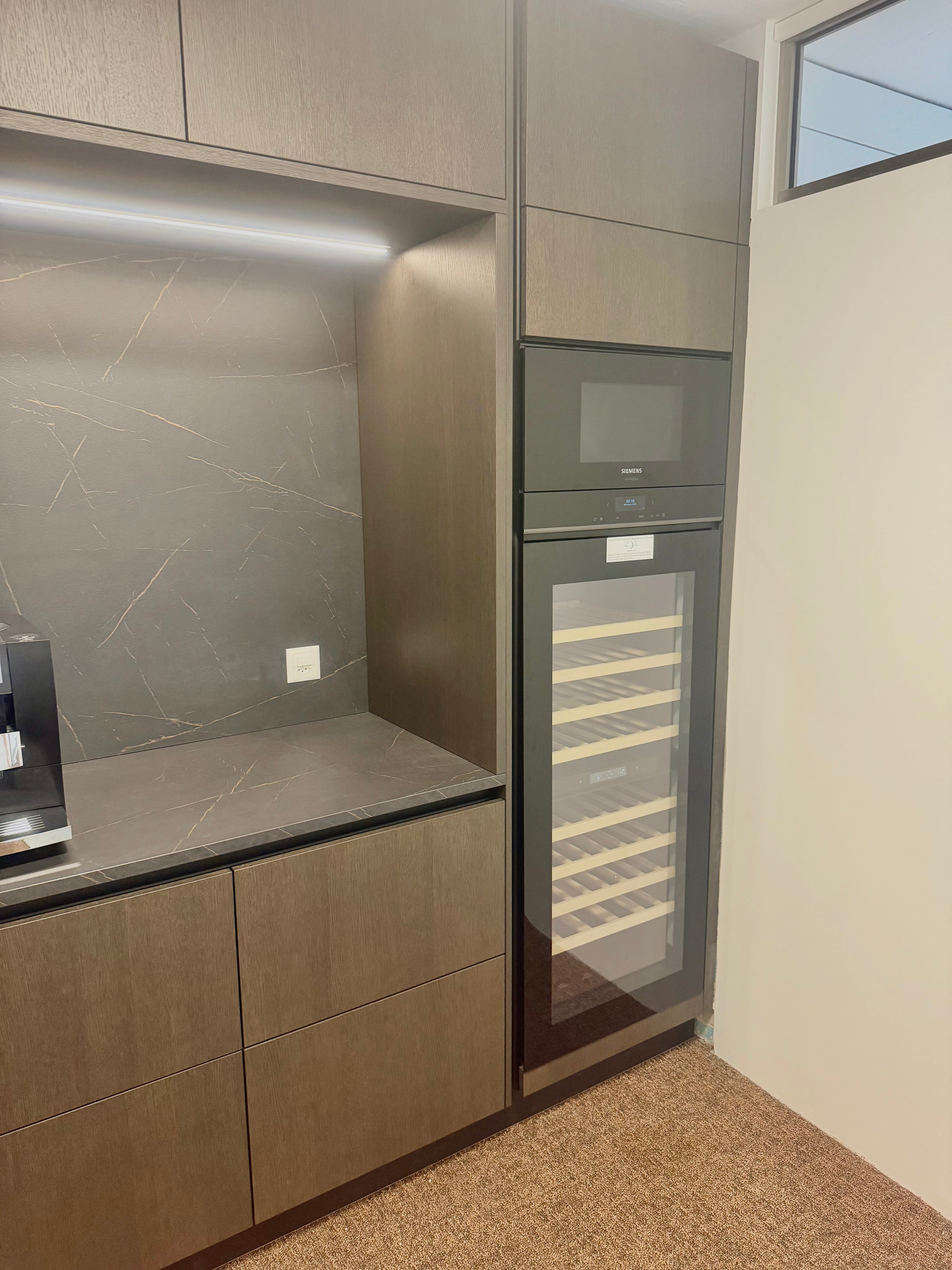 cuisine de cafétéria Ballerina, agencée Siemens StudioLine & cave à vin.
